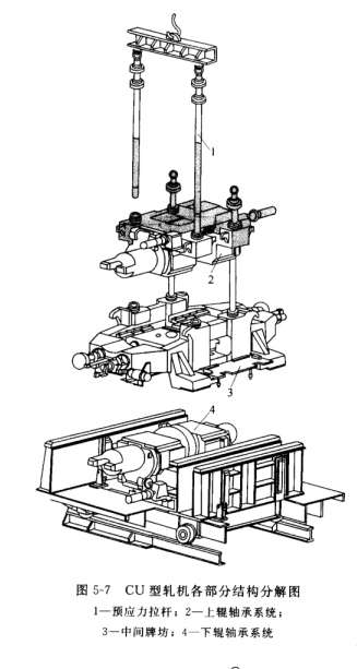 CU型軋機(jī)是一種無機(jī)架緊湊式****軋機(jī),是近年來發(fā)展起來的新型機(jī)種。圖 5-7 所示為CU型軋機(jī)各部分結(jié)構(gòu)分解圖。