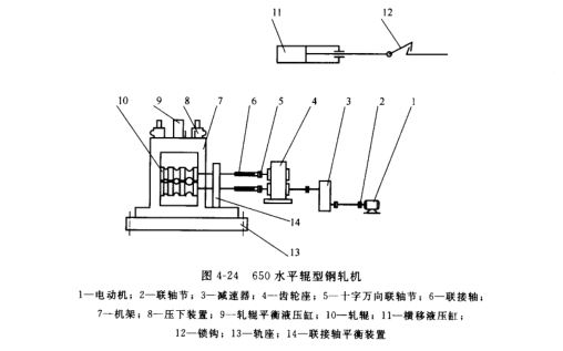 650水平輾型鋼軋機(jī)如圖 4-24所示。主要由主傳動裝置、機(jī)架、機(jī)架換移裝置、壓下裝置、軋輥平衡裝置、軌座等組成。