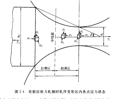 變形區(qū)內(nèi)各點(diǎn)的應(yīng)力狀態(tài)是不均勻的。在有前后漲力軋制時(shí),變形區(qū)中部呈三向壓應(yīng)力狀態(tài),靠近入口和出口處,由于張力的作用,金屬呈一向拉應(yīng)力和兩向壓應(yīng)力狀態(tài),如圖2-4所示。變形區(qū)內(nèi)應(yīng)力狀態(tài)的形成,主要是由于接觸弧上單位壓力和摩擦力的影響。單曹成應(yīng)力狀態(tài)分布不均勻的現(xiàn)象,則受到很多因素的影響。