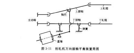 其那面說(shuō)過(guò),萬(wàn)向連接軸一般都比較長(zhǎng),重量也比較大,為老不使萬(wàn)向接軸的重量全部壓在兩端的插頭上,一般都設(shè)置了聯(lián)軸的平衡裝置。其平衡力一般比連接軸重量重10%~30%。常用的平衡裝置又彈簧平衡,中錘平衡和液壓平衡三種形式。彈簧平衡一般只用于下聯(lián)接軸的平衡,如圖3-11所示。因?yàn)橄侣?lián)軸軸所連接的軋輥在軋制過(guò)程中是不需要調(diào)整其位置的。上連接軸因?yàn)樵谲堓佭^(guò)程中輥提升兩較大,老的軋機(jī)用重錘平衡,較新的軋機(jī)都使用液壓平衡。