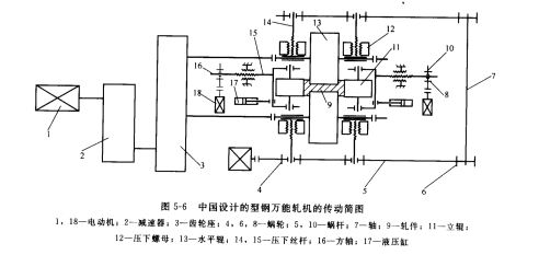 普通型鋼****軋機是在普通二輥軋機的基礎(chǔ)上發(fā)展起來的。圖5-6 所示為一臺中國設(shè)計的型鋼****軋機的傳動簡圖,用于軋制軌梁和大型 H型鋼的****軋機,此軋機有主動的水平軋輾,還有非傳動的立輾。立輾和水平輥在同一垂直平面內(nèi),為能在水平輾軸承座間放置立輥及其軸承座,水平輥的輥頸很小,立輾的開口度由蝸輪蝸桿機構(gòu)調(diào)整,其蝸輪裝在側(cè)壓螺絲的方頭上,其水平輾直徑為帆800~900mm,開口度為140~900mm。較大軋制力水平輥為10000kN,立輥為6000kN,軋制速度為 0.4~9m/s。機架為閉式機架。上下水平輥的壓下裝置為電動,而且上、下輥的兩套壓下裝置間用機械聯(lián)鎖同步;立輥側(cè)壓進裝置也為電動。上水平輥及立輥均采用液壓平衡裝置。