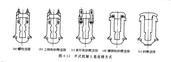 (4)橫銷和斜楔連接 這種連接方式是將機架上蓋的下部插在立柱上端的凹槽內,并用穿透的橫向圓銷連接,再用斜楔楔緊,此種連接結構簡單、 連接牢固、連接件變形小、 剛性較好、換輥方便,但由于楔緊力和軋制沖擊力的影響,橫銷易發(fā)生變形,影響拆卸和換輥。