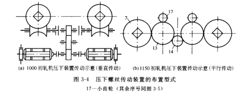②采用圓柱齒輪平行傳動方案。立式電動機(jī)上的小齒輪 17 【圖 3-4(b)】 分別通過中間大惰輪 13 帶動固定在方孔套筒6 上的大齒輪 7,而使壓下螺絲在螺母 3中旋轉(zhuǎn)并實(shí)現(xiàn)上下移動。