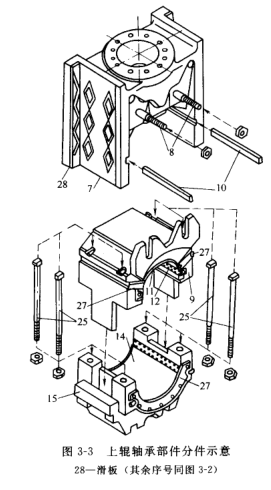 壓下裝置的齒輪和軸承以及壓下螺絲、螺母和套筒都用稀油循環(huán)潤滑。潤滑油從壓下螺絲頂部的噴油環(huán)8噴出。