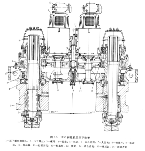 為實(shí)現(xiàn)兩個(gè)壓下螺絲同步移動,以保持上輥的平行升降,兩個(gè)大惰輪 13 之間用一個(gè)離合齒輪 14相連。離合齒輪通過兩個(gè)滾動軸承裝在液壓缸 15 的柱塞桿 12 上,在液壓推動下,當(dāng)柱塞升起時(shí)切斷與兩中間惰輪之間的聯(lián)系,即可實(shí)現(xiàn)兩個(gè)壓下螺絲的單獨(dú)調(diào)整。傳動齒輪總速比為4.5,壓下螺絲的直徑和螺距為 440×48mm。壓下螺絲的移動量是用指針盤反映給操作臺,指針通過單獨(dú)的齒輪傳動與中間惰輪軸上的圓錐齒輪 16相連。
